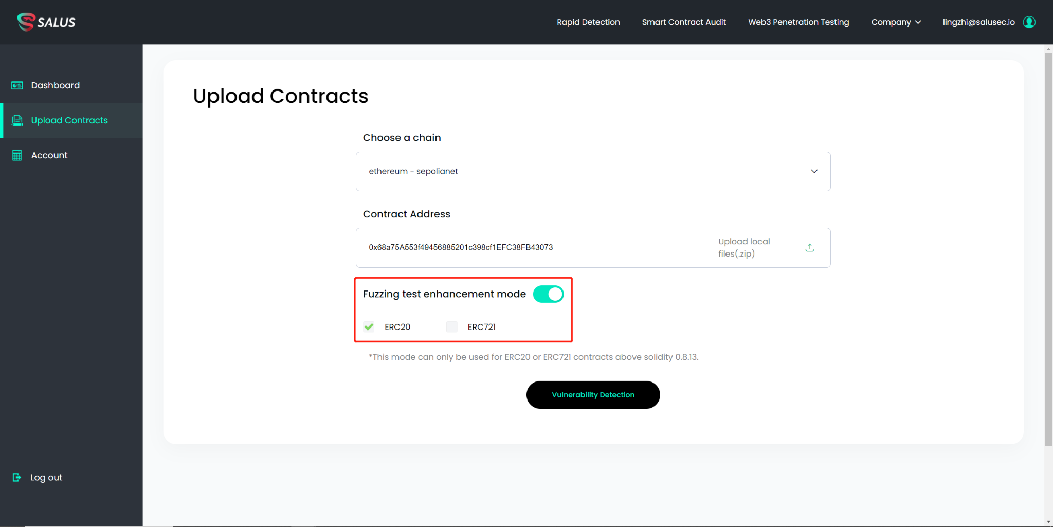 Below, using the contract with address 0x68a75A553f49456885201c398cf1EFC38FB43073 from ethereum-sepolia as an example, the Lighting Cat tool is used to perform fuzzing test on it. In this case, you're utilizing the "Fuzzing test enhancement mode" and selecting the contract type as either ERC20 or ERC721. Additionally, this mode is compatible with contract compiler versions 0.8.13 and above.